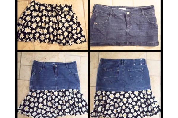 Vágd le a farmer felső részét (a szárából majd varrhatsz táskát magadnak). Egy megunt, mintás szoknya vagy egy darab textil kell még hozzá. A bő szoknyarészt egyszerűen ráncold be kicsit, és varrd körbe egyenes öltéssel. Látványos és időtakarékos – családos anyukáknak igazi mentőötlet. Idén fölvehetsz egy dögös, színes harisnyát is hozzá!