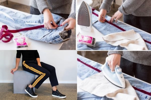 A legegyszerűbb, ha vasalós ragasztószalagot használsz: csak ráhelyezed a csíkot, levasalod, és ha szeretnéd tartósabbá tenni, egyenesen letűzöd varrógéppel. Világos nadrágon jól mutat egy friss tavaszi pasztellcsík, sötéten pedig élénk színű.